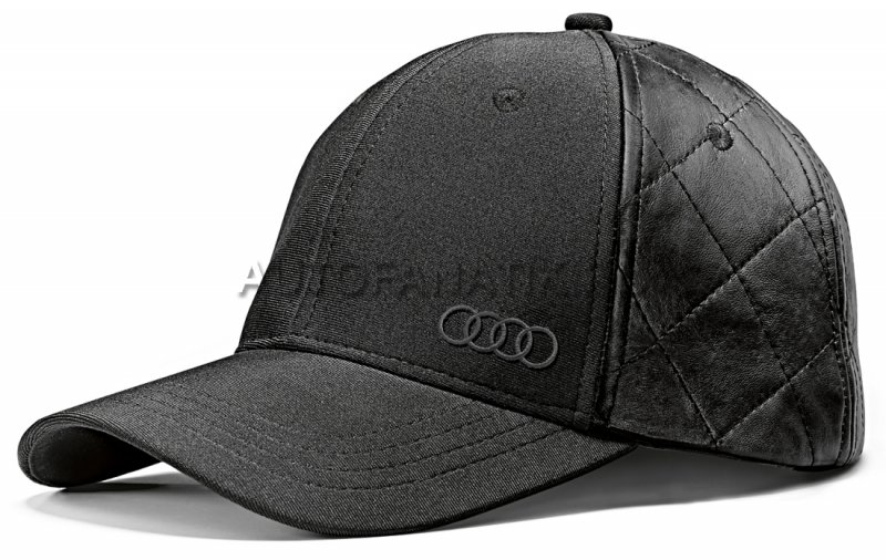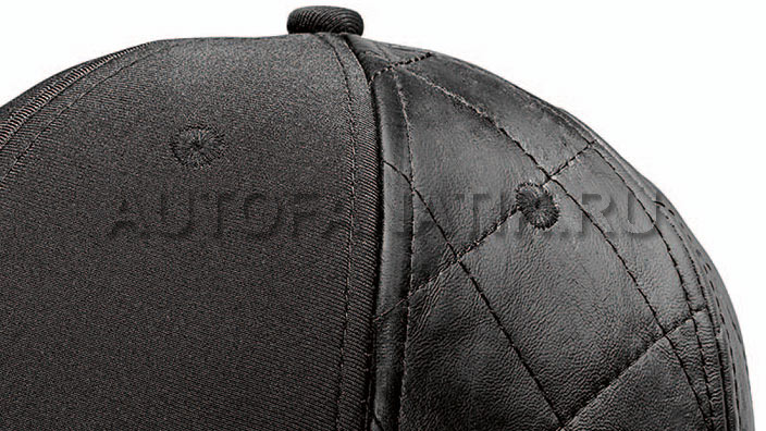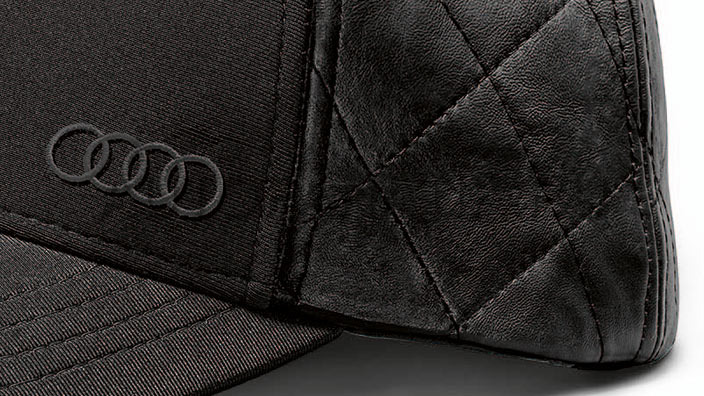 Бейсболка из овечьей кожи и неопрена. Строчка в виде ромбов, как на спортивных сидениях автомобиля, логотип Audi, вышитый цветной нитью. Размер регулируется. Совместный продукт с фирмой P Zero.