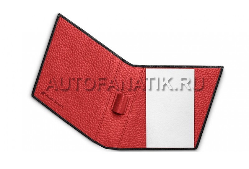 Блокнот в форме ромба с обложкой из черной кожи, внутренняя отделка из красной кожи с тисненым логотипом Audi Sport, петля для ручки посередине. Изготовлено в Германии.