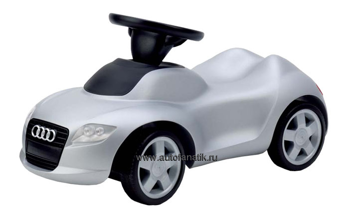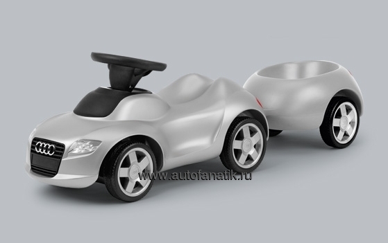 Без прав, но с большим увлечением дети в возрасте от 1 года до 3 лет могут использовать этот игрушечный автомобиль. Так как правила дорожного движения в данном случае не действуют, на рулевом колесе автомобиля имеется клаксон. Кроме того, автомобиль оснащен бесшумными шинами и креплением для прицепа. Размеры: 74 x 38 x 30 см. Серебристый цвет. Внимание! К автомобилю может быть присоединен прицеп (серебристый или красный - на выбор). Прицеп к автомобилью в комплект не входит, заказывается отдельно. Партномер (артикул) серебристого прицепа: 3201000200