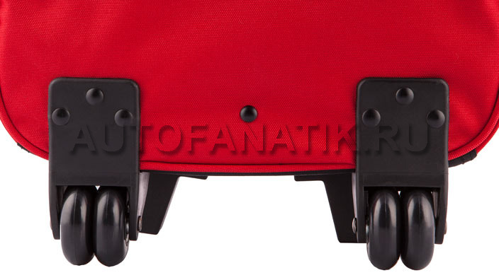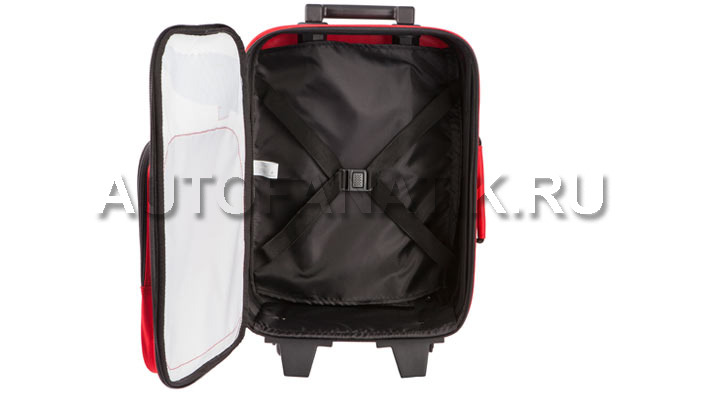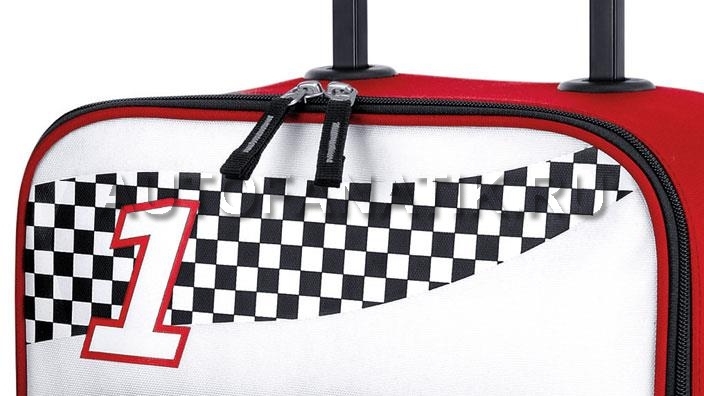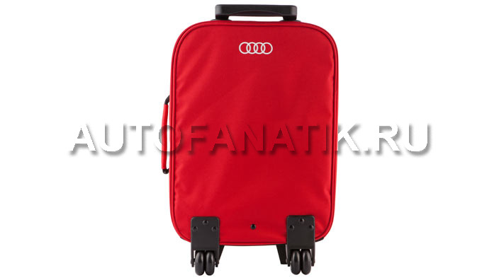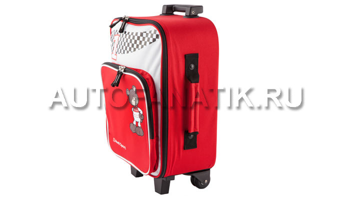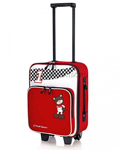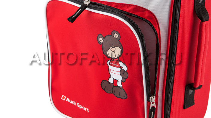 Незаменимая вещь для путешествий - практичный детский чемодан на колёсах с изображением медвежонка-гонщика Audi и финишного флажка. Чемодан имеет двойные колёсики, опорные ножки, выдвижную ручку и дополнительную ручку сбоку. Основное и дополнительное отделения застёгиваются на двустороннюю молнию. Совместный продукт с фирмой Deuter. Материал: 600d полиэстер. Размер: 40 x 30 x 16 см. Объём: 20 литров. Вес: ок. 2000 г.