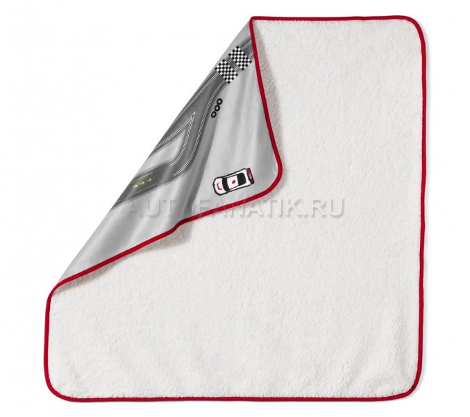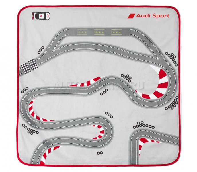 Гладкая верхняя сторона с дизайном гоночной трассы, красная матовая окантовка. Гладкий короткий ворс сверху, дополнительная шерстяная шерпа снизу. Логотип Audi Sport в правом углу.