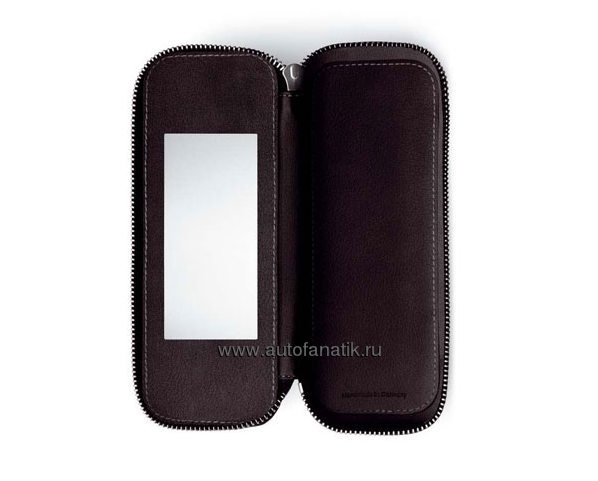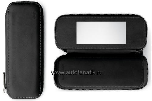 Здесь без труда поместится все необходимое для макияжа, включая тушь: футляр из тонкой воловьей кожи с натуральной лицевой поверхностью и зеркальцем на крышке. Размеры: 19 x 8 x 5 см.