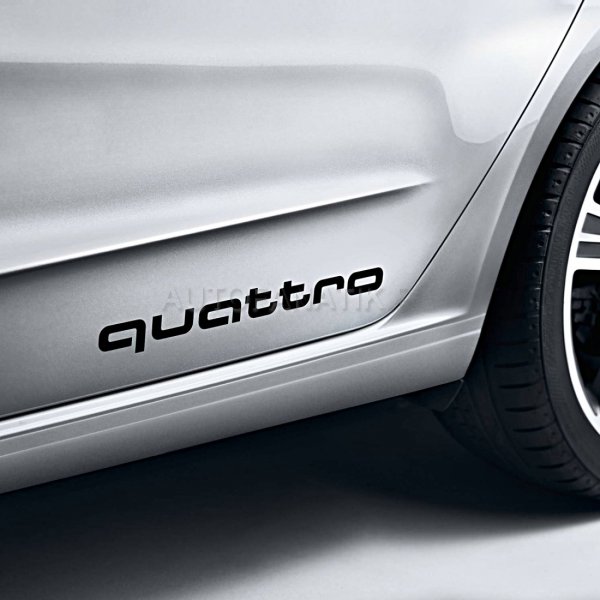 Оригинальный комплект из двух наклеек с надписью quattro черного цвета для автомобилей со светлым цветом кузова. Размер каждой наклейки 35.5 х 3.5 см.