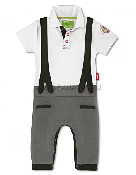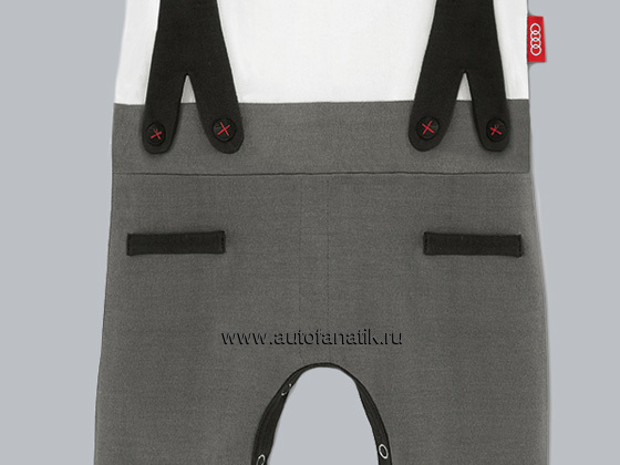 Боди с вышивкой скобки, нижняя часть может быть полностью расстегнута между ног, значок Audi “First steps” Материал: 100% хлопок. Цвет: белый/серый. Размеры: