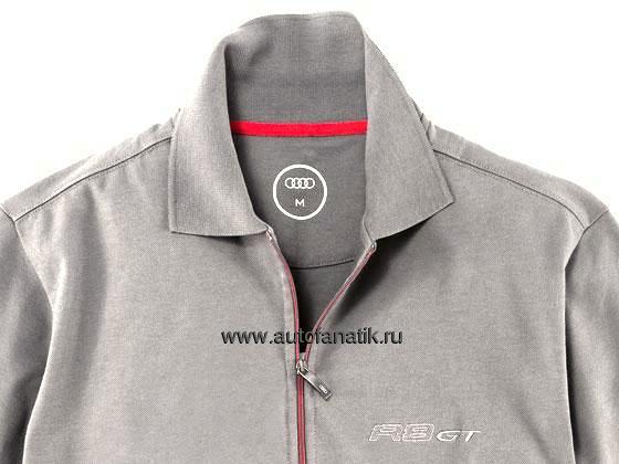 Рубашка-поло серого цвета на молнии, изготовлена из хлопка и эластана пике. Логотипом Audi и R8 GT, разрешается машинная стирка.