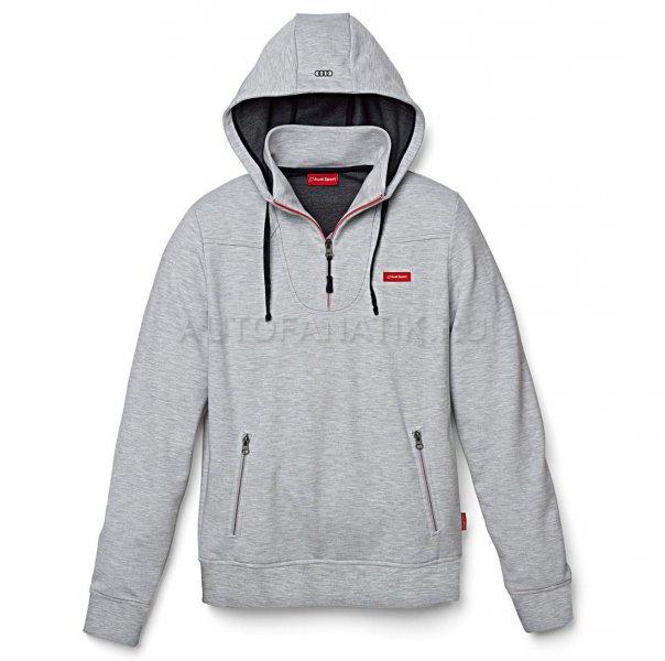 Мужская толстовка с воротником-стойкой и капюшоном, красные застежки-молнии (красные зубчики) расставляют сдержанные цветные акценты. Наружная сторона — серый меланж, черно-серая подкладка. На груди нашивка-логотип Audi Sport. Мягкий материал, высокий воротник с короткой молнией, большие передние карманы на молнии. Кольца Audi на капюшоне. Материал: 70% полиэстер, 30% хлопок.