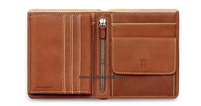 Отдел для мелочи, два отделения для банкнот, различные отсеки для кредитных карт, отдельный отсек для паспорта и водительского удостоверения, эмблема Horch. Размеры: 12 x 15 x 3 см.