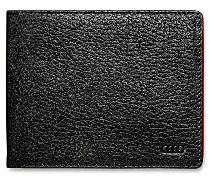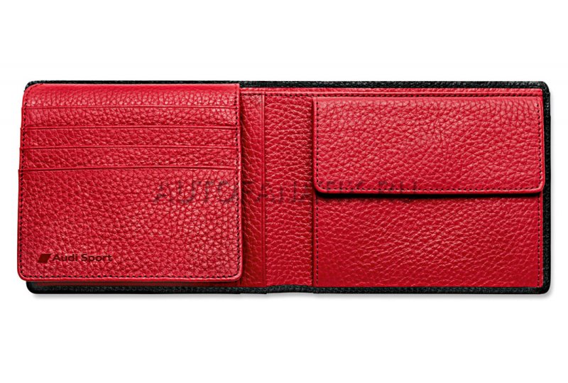 Мужской кошелек поперечного формата, снаружи - черная воловья кожа, внутри - спортивная красная кожа, клапан, в общей сложности 10 отделений, отделение из сеточки для удостверения личности, два больших отделения для банкнот, тиснение - логотип Audi Sport. Изготовлено в Германии.