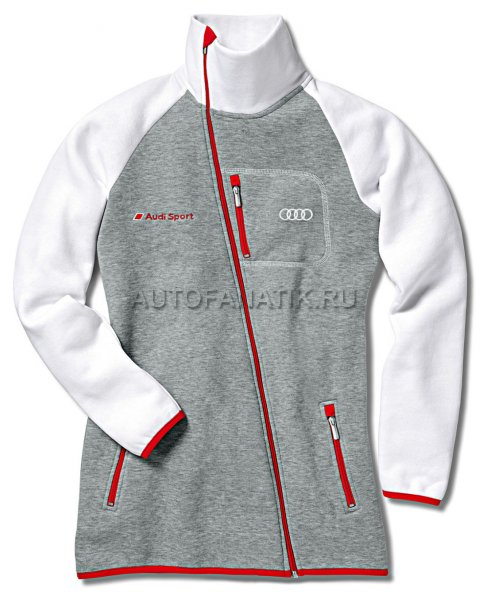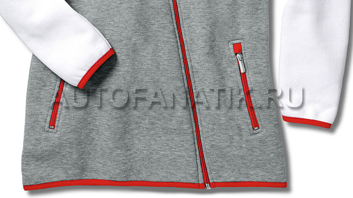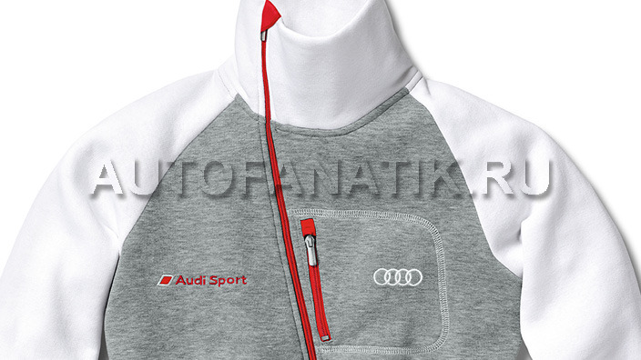 Потертый изнутри материал толстовки, узкая застежка- молния спереди, красные молнии, манжеты рукавов и пояс с красной тесьмовой отделкой, высокий воротник- стойка, замок молнии цвета алюминия с вытесненными кольцами Audi, с лицевой стороны логотип Audi Sport и фирменные кольца Audi.