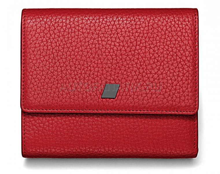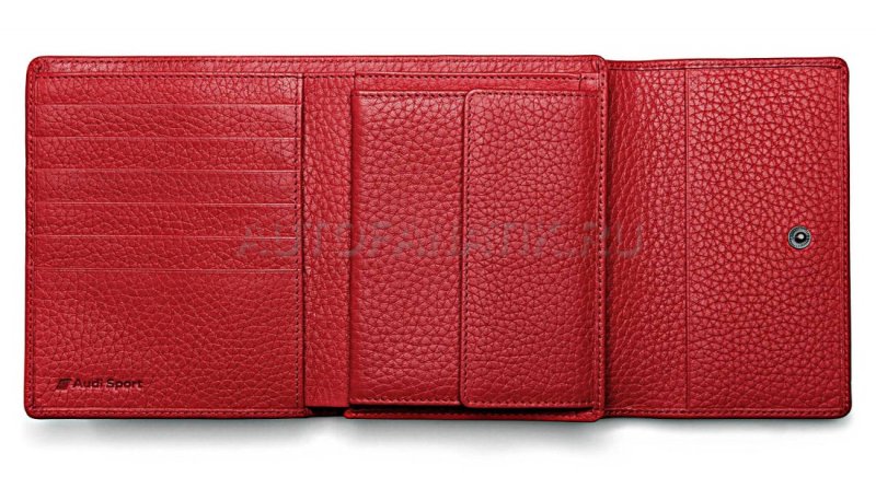 Кошелек из воловьей кожи с застежкой на металлических кнопках в виде ромбов, 2 отделения для купюр, отделение для мелочи, 6 отделений для карт и одно глубокое отделение. Внутри — тисненый логотип Audi Sport. Сделано в Германии. Размер: 11 x 12,7 x 1,7 см.