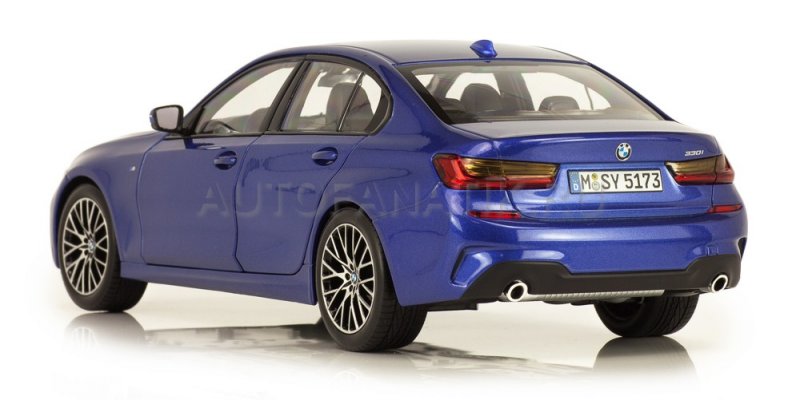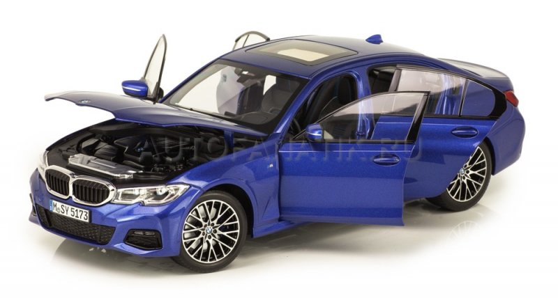 Масштабная модель седана среднего класса BMW 3 серии в кузове G20, представленного в 2018 году. Модель седьмого поколения 3-й серии, представлена в оригинальном синем цвете "Portimao Blue". Детальный интерьер и моторный отсек. Салон флокирован. Резиновые шины. Литая миниатюра с открывающимися дверьми и капотом. Масштаб: 1:18