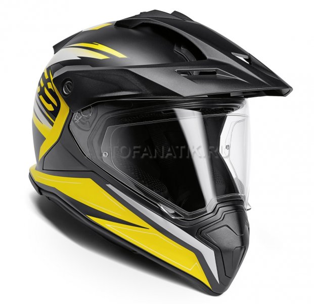 Съемная подбородочная часть и пылевой фильтр для свободного доступа воздуха во время поездок по бездорожью и в жаркие дни. Съемные и моющиеся подушечки для головы и щек. Ремешки на затылке для надежной фиксации шлема. С подготовкой для установки коммуникационой системы BMW Motorrad. Трансформируется за несколько секунд. Допуск согласно ECE 22-05. Масса: около 1450 г. (с щитком и визиром с двойным стеклом).
