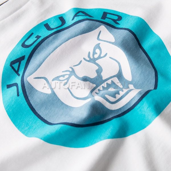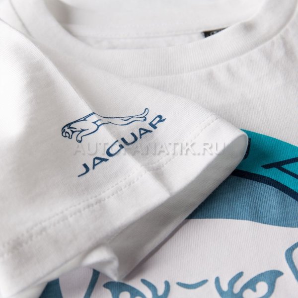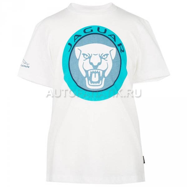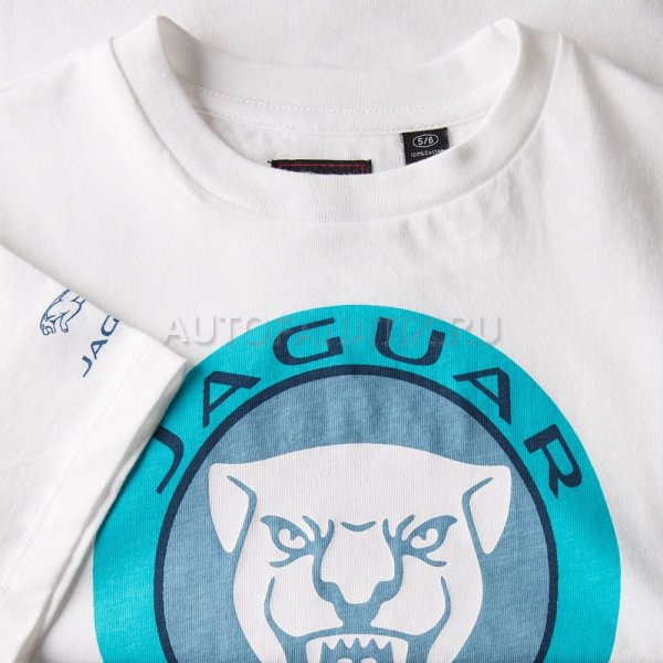 Футболка "Рычащий ягуар", из 100% хлопка с крупной эмблемой бренда на груди и круглым воротом. Надпись Jaguar на рукаве и ярлычке, расположенном снизу на боковом шве. Все размеры на возраст от 2 до 10 лет.