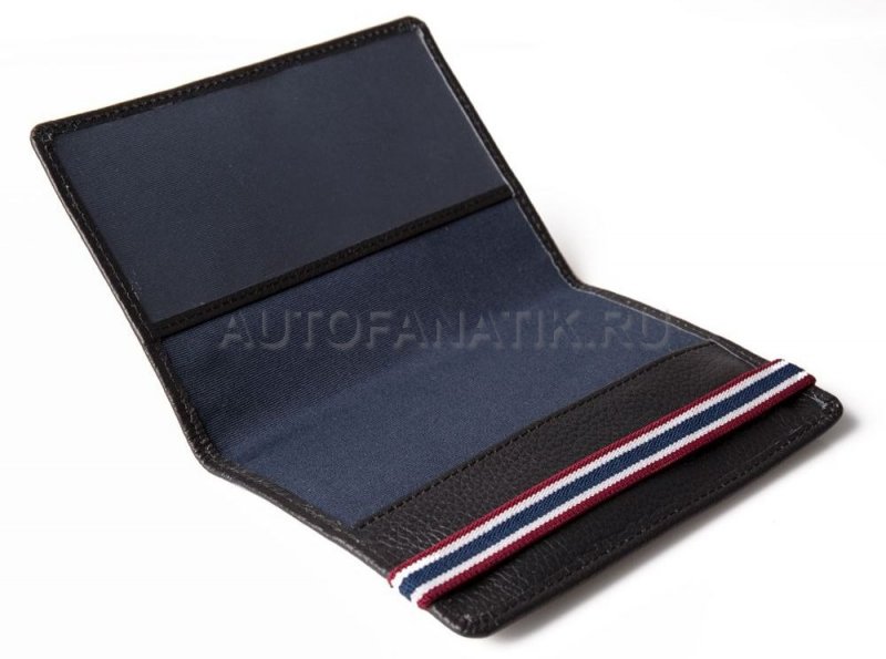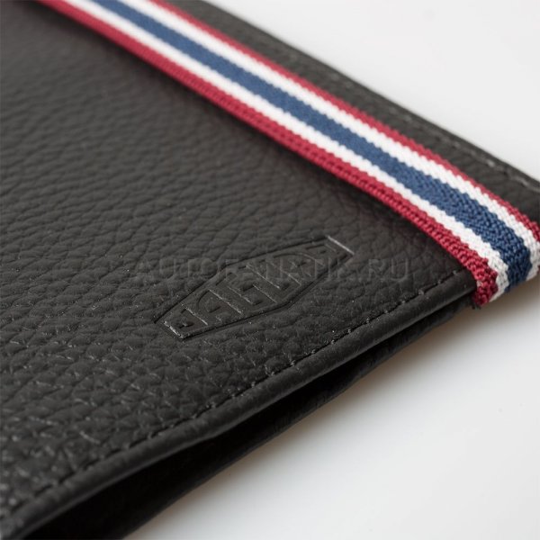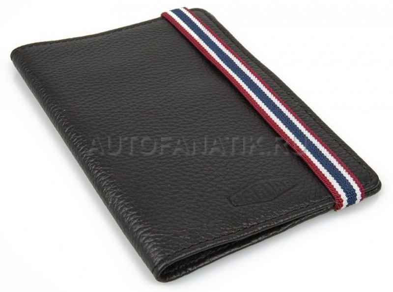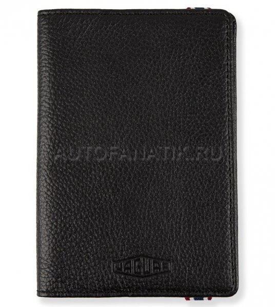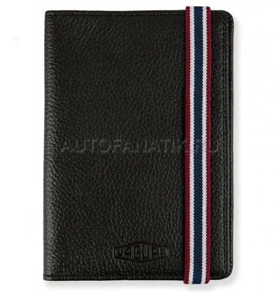 Чёрная стильная кожаная обложка для паспорта c эластичной трёхцветной полоской, напоминающей оформление гоночного автомобиля Jaguar E-TYPE Lightweight, и тиснёным историческим логотипом компании.