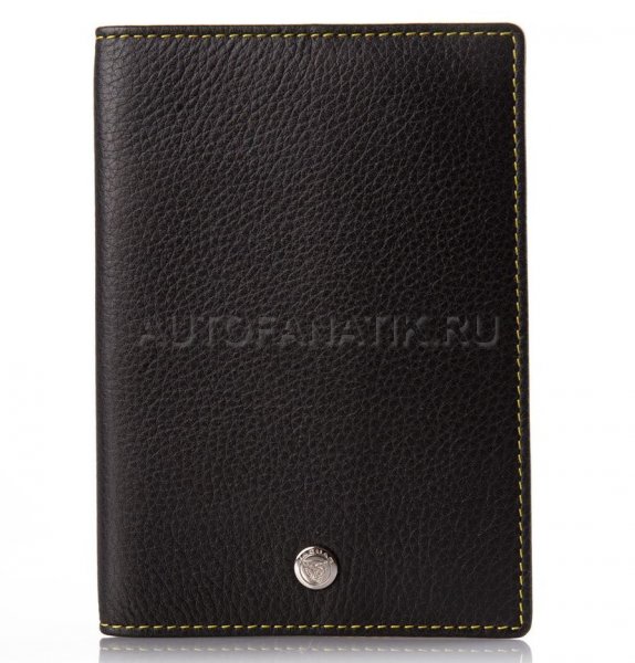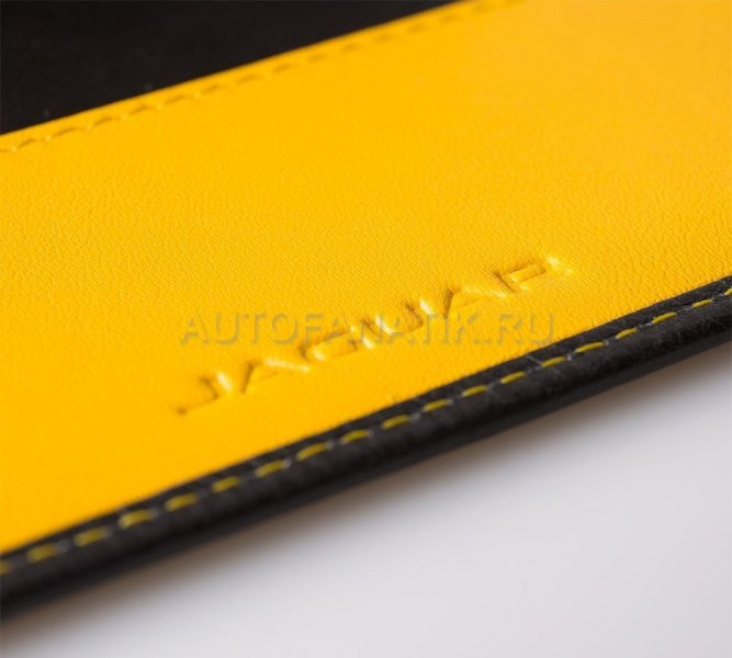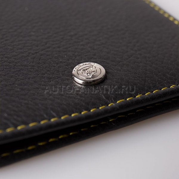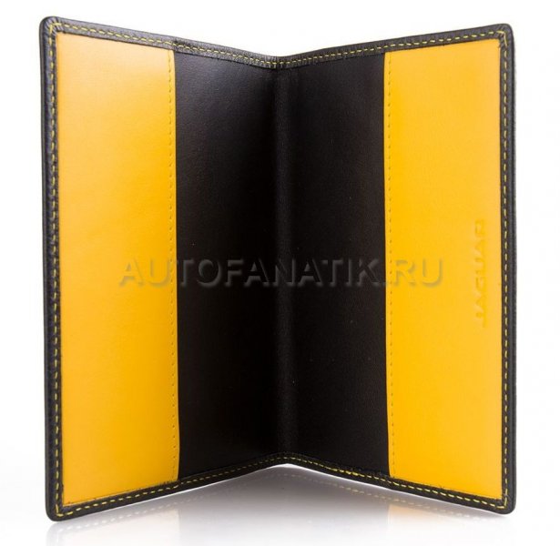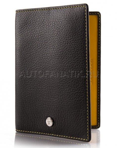 Обложка для паспорта Jaguar из высококачественной мягкой кожи. Цвет: черный (внешний), внутренняя часть: комбинация черной и желтой кожи. Контрастная прострочка желтыми нитками по периметру. Металлический значок с эмблемой Jaguar на фронтальной части и тиснение "Jaguar" внутри. Артикул: 50JDLG720BKA