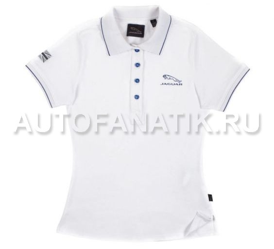 Женская приталенная рубашка-поло из ткани, состоящей из 95% хлопка и 5% эластана. С силиконовым логотипом Jaguar, расположенным на груди, и изящными пуговицами с символикой бренда. Нашивка в виде Британского флага на рукаве. Цвет белый с серо-синими акценами (полосы на рукавах и пуговицы).