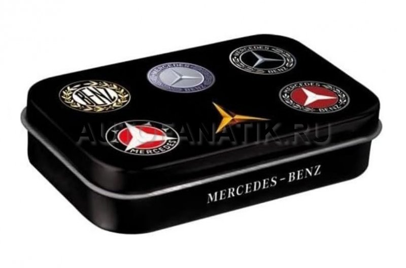 Металлическая коробка для конфет с ретро-логотипами Mercedes-Benz. Изготовлена из чистого листового металла и отличается особой прочностью. Тиснение на крышке придает ей особую эффектность.