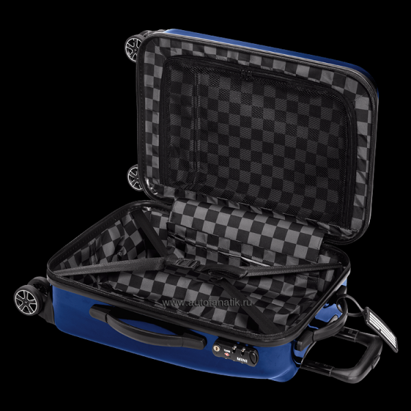 Идеальный спутник в Ваших путешествиях: свободно помещается в любом MINI и при этом предлагает достаточно места для всего необходимого - даже для продолжительных поездок. Очень легкий чемодан с прочным корпусом. Две ручки для переноски и четыре колесика с дизайне колесных дисков MINI гарантируют удобство в обращении. С разделительной сеткой между отделениями, защитным чехлом для перевозки, замком TSA и табличкой для подписи имени владельца. Подкладка выполнена в дизайне клетчатого флага. Размеры: 70,5 x 49,5 x 27,5 см. Масса нетто: 4,2 кг. Артикул: 80 22 2 318 632