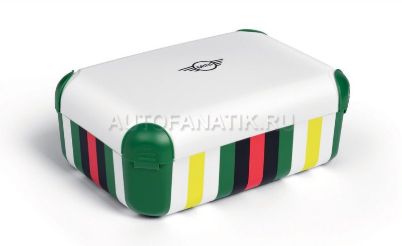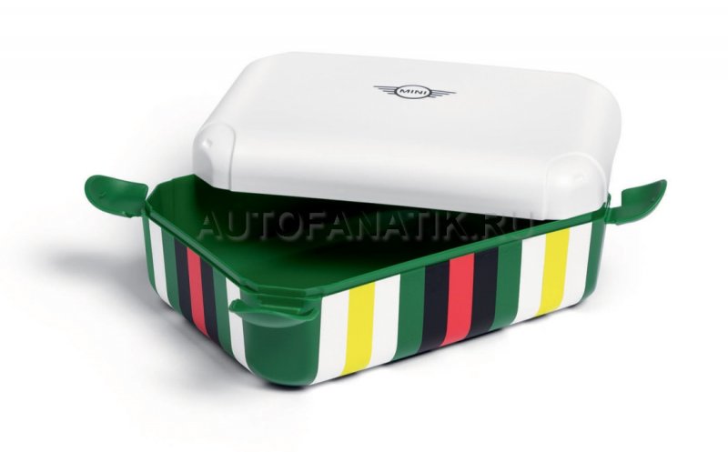 Коробка для завтрака с полосатым принтом, белой крышкой с четырьмя фиксаторами. Логотип MINI Wing с черной надписью по центру крышки. Размеры: 16 × 11 × 6 см.