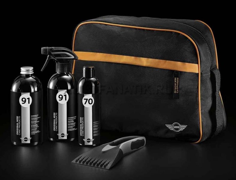 Комплект содержит: незамерзающая жидкость для омывания стекол с антифризом (1 x 500 мл.), антиобледенитель (1 х 500 мл.), средство по уходу за интерьером (1 х 250 мл.) и скребок. Набор уложен в практичную сумку с логотипом MINI. Артикул: 83 12 2 318 507