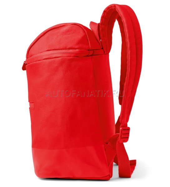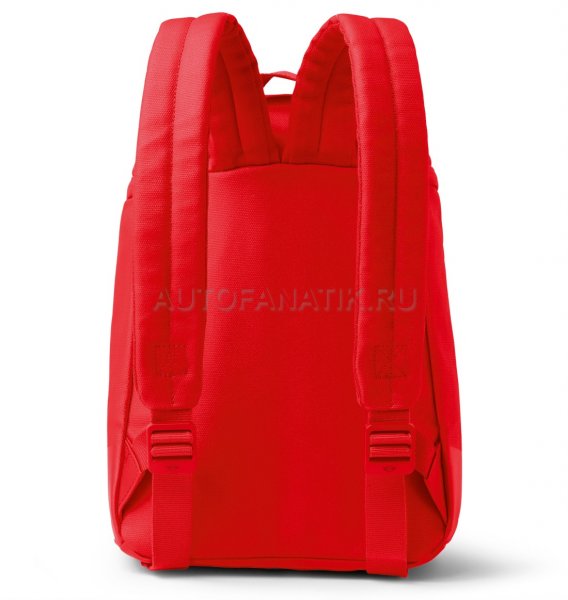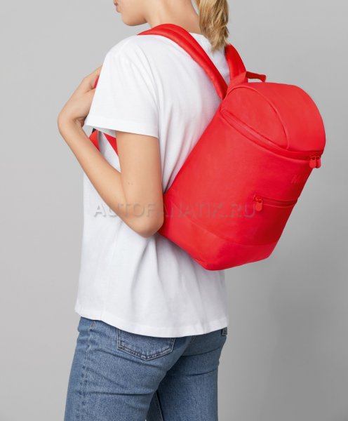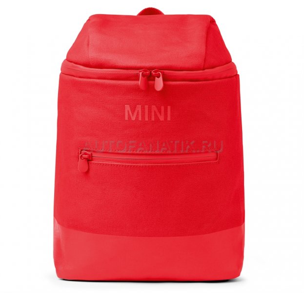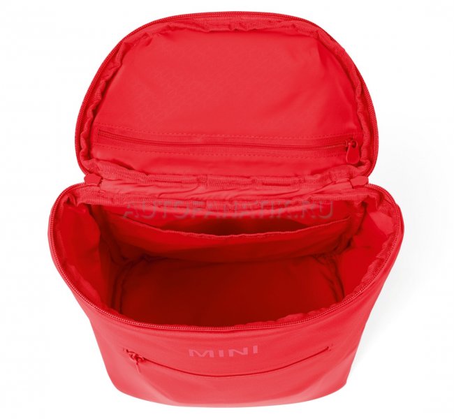 На фронтальной панели размещается резиновый логотип MINI Wordmark и чуть ниже отдельный карман на молнии. В верхней части есть ручка для переноски. Основной отсек закрывается на двустороннюю застежку молнию. Внутри имеется карман на молнии, встроенный в крышку рюкзака, и открытое отделение для Вашего ноутбука.