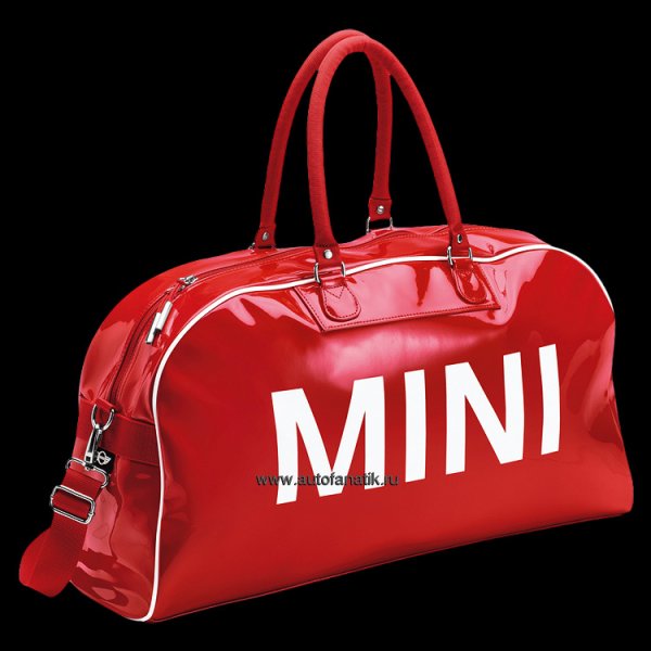 Большая сумка в ретро-стиле с контрастными кантами и надписью MINI на обеих сторонах. Внутреннее отделение с молнией, красной подкладкой и съемным дном для усиления. Съемный наплечный ремень, две ручки. Материал верха: пластик, материал внутри: нейлон. Размеры: 59 см х 17 см х 33 см. Артикул: 80 22 2 294 747