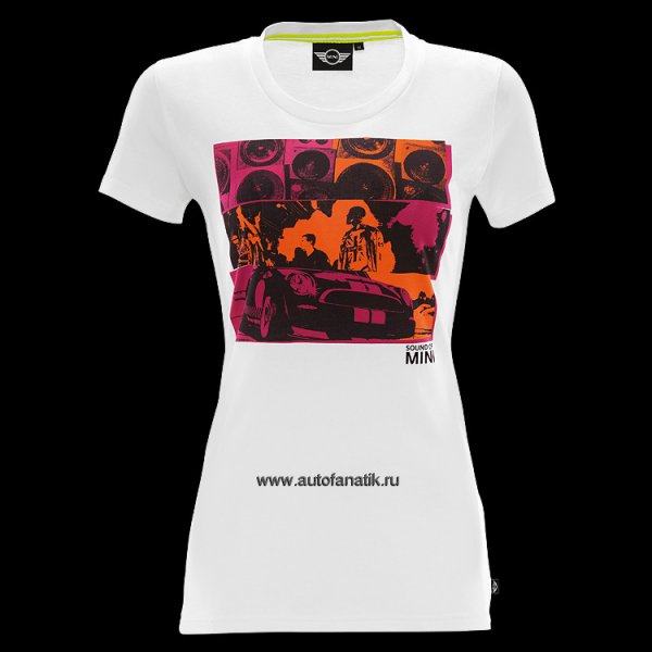 Яркие цвета для любителей моды: броская футболка Festival с малиновыми и оранжевым цветами. Подчеркивает фигуру, с надписью "Sound of MINI". 100 % хлопок. Размеры: