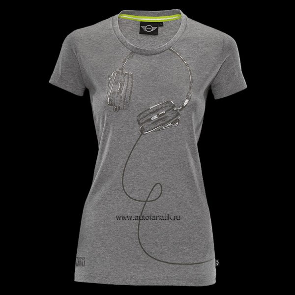 Приятная футболка узкого покроя с серым принтом наушников и деталями цвета серебристый металлик для ночи за пультом ди-джея. Черная надпись "Sound of MINI" внизу и полоски в верхней части спины белого цвета и цвета Lime Punch. 100% хлопок.