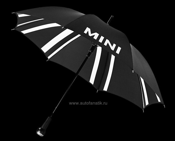 Этот автоматически раскрывающийся зонт-трость Mini просто жалко использовать в плохую погоду. В любом случае ты можешь пользоваться им как тростью при возвращении домой после долгой ночи. Черная алюминиевая рама, обтянутая черным шелком из полиэстера. Сверху принт MINI белого цвета. Внутри рисунок Black Jack. Ручка из металла, пластика и кожи в виде ручки рычага переключения передач MINI. Диаметр: 105 см, длина 85 см. Артикул: 80 23 2 213 349