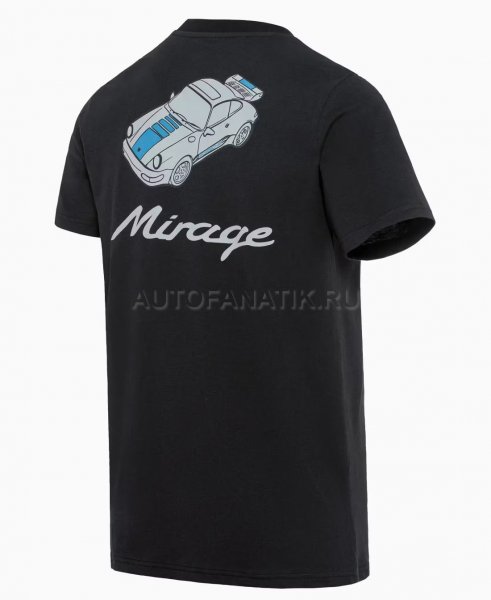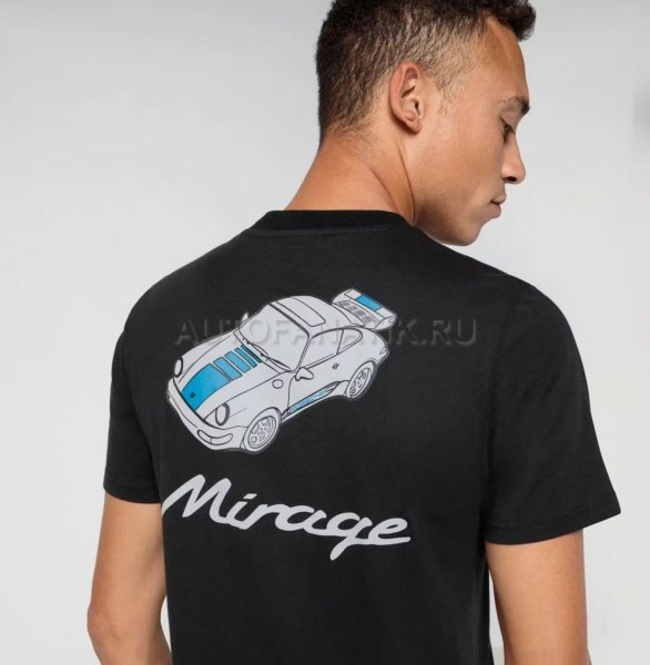 На рукаве красуются надпись Mirage и гоночные полосы. Передняя часть футболки украшена изображением автобота с надписью Porsche.