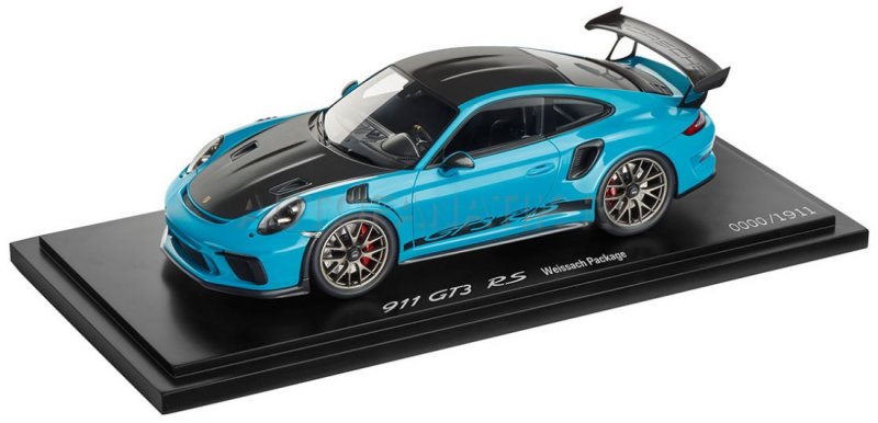 Крупная коллекционная модель автомобиля Porsche 911 GT3 RS с пакетом "Weissach package". Цвет: синий ("Miami Blue"). Интерьер в черном цвете. Кузов из металла, детали из пластика. Масштаб 1:18. Ограниченная серия: будет выпущено всего 911 экземпляров.