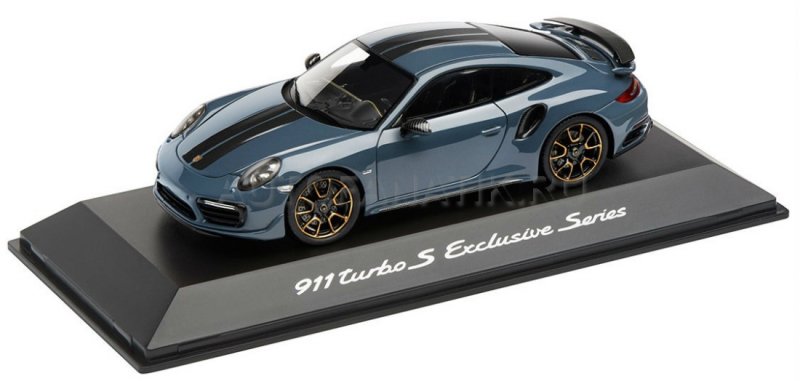 Масштабная модель Porsche 911 Turbo S, Exclusive Series. Цвет кузова: графитовый синий "Graphite Blue Metallic". Интерьер в черном/золотистом цветах. Кузов из металла. Масштаб 1:43.