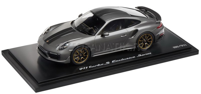Масштабная модель Porsche 911 Turbo S Exclusive Series. Цвет: серый металлик (agate grey metallic). Цвет интерьера салона: черно-золотистый. Из металла и пластика. Масштаб 1:18. Ограниченная серия: 911 экземпляров.