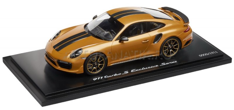 Масштабная модель Porsche 911 Turbo S Exclusive Series. Цвет: золотистый металлик (Golden Yellow Metallic). Цвет интерьера салона: черно-золотистый. Из металла и пластика. Масштаб 1:18. Ограниченная серия: 911 экземпляров.