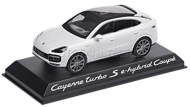 Масштабная модель топового гибридного купе-кроссовера Porsche Cayenne Turbo S E-Hydbrid Coupé (поколение кузова E3), выполнена в белом цвете "Carrara White". Интерьер в черном цвете. Кузов из металла и пластика. Масштаб 1:43.