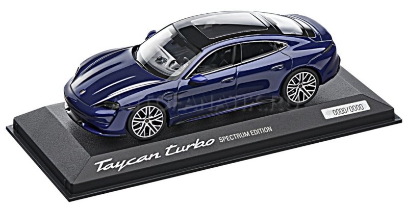 Масштабная модель электрического Porsche Taycan Turbo, ограниченное издание. Кузов из металла, в оригианльном синем цвете "Gentian Blue", интерьер выполнен в черно-серых тонах "Black/Slate Gray".