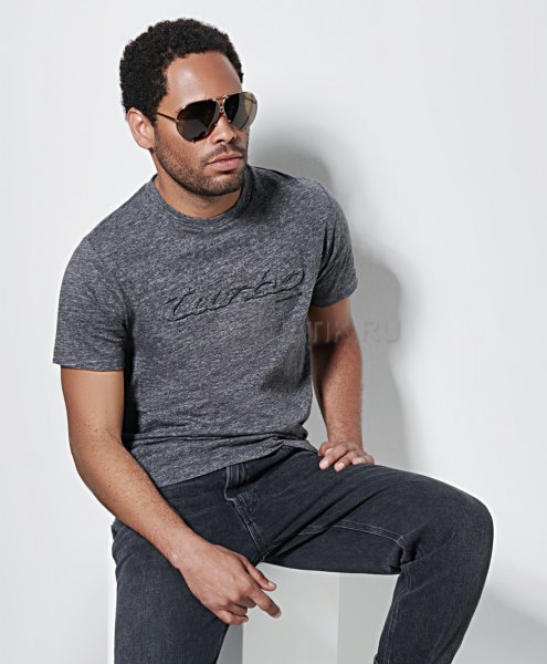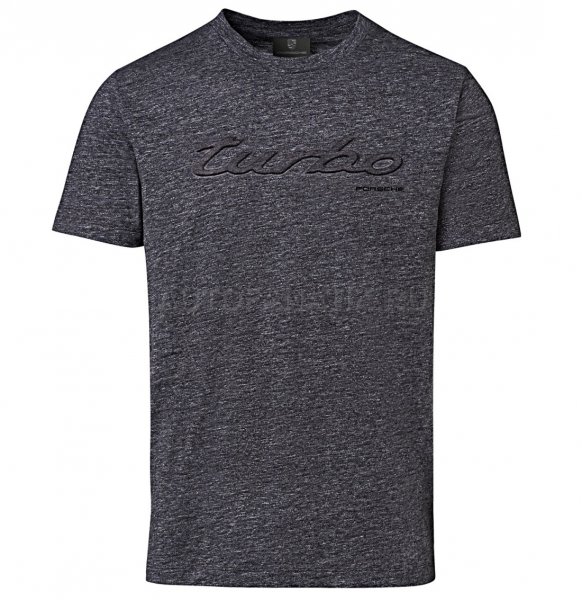 Спортивная мужская футболка с короткими рукавами, большим объемным логотипом "Turbo" и небольшим печатным логотипом "PORSCHE" на груди. Материал: 50% хлопок, 50% эластан. В сером цвете.