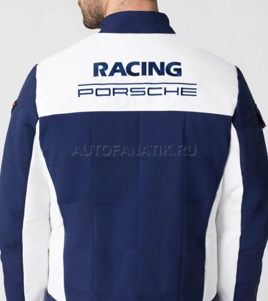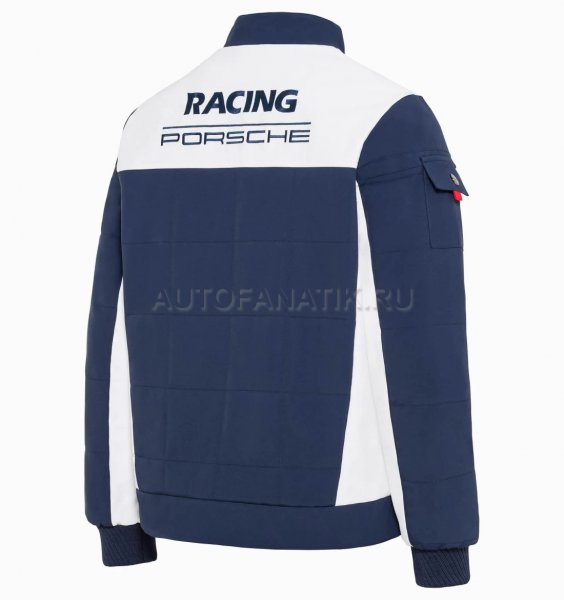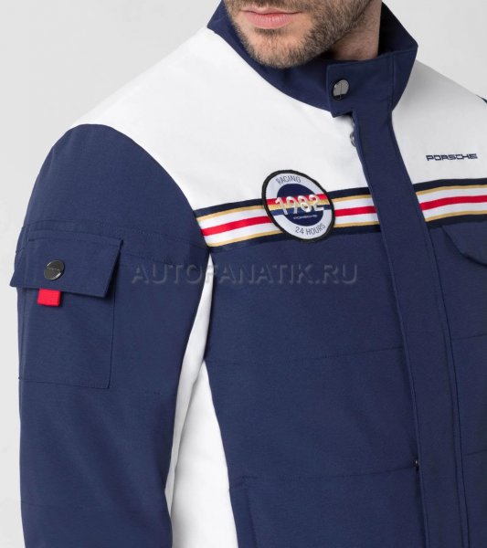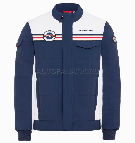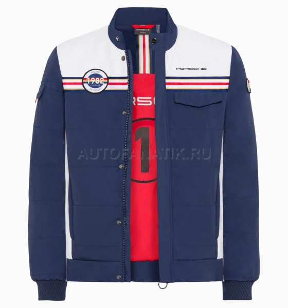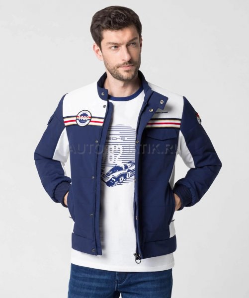 Застежка-молния спереди. Один нагрудный карман, один карман на предплечье, два боковых кармана и один внутренний карман. Воротник-стойка с застежкой по низу. Кнопки с принтом Porsche. Рукава и низ с ребристыми манжетами. Большой гоночный логотип на спине.