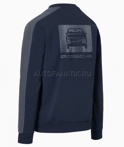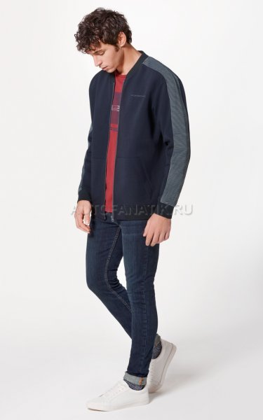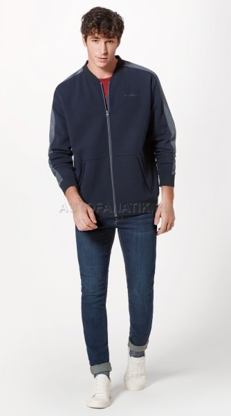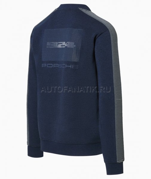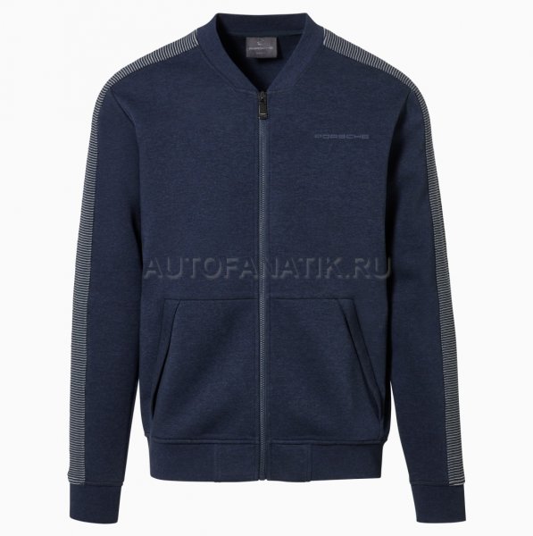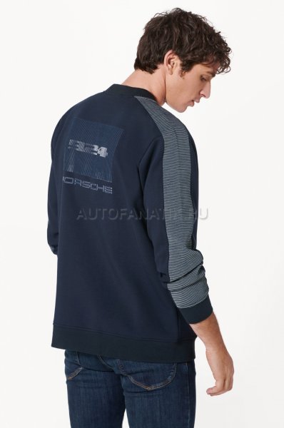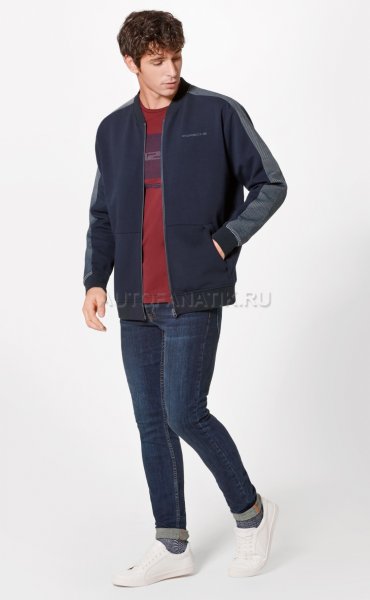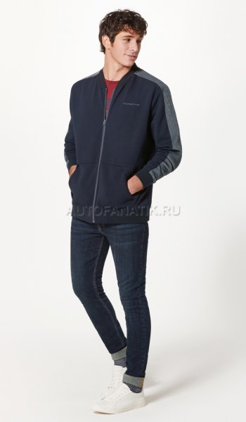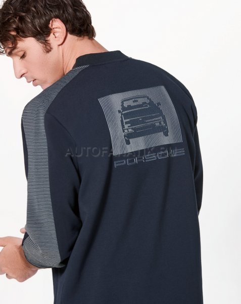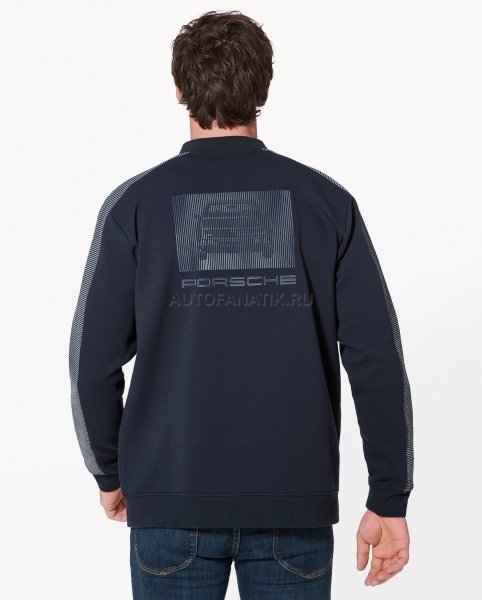 Спортивная куртка с бейсбольным воротником и двумя боковыми карманами, вдохновленная дизайном легендарного Porsche 924. Верх рукава с двухцветной ребристой структурой светло-серого / темно-синего цветов. 3D-принт на спине с изображением двух разных мотивов в зависимости от угла обзора. Материал: 70% хлопок, 24% полиэстер, 6% эластан. Выполнена в темно-синем цвете.