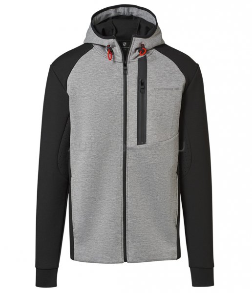 Мужская толстовка с капюшоном и перфорированными элементами для оптимальной вентиляции. Рукава в стиле реглан. С боковыми карманами на молнии и нагрудный карман с логотипом «PORSCHE». Материал: 68% полиэстер, 25% вискоза, 7% эластан. Цвет: серый / черный. Детали в красном цвете.