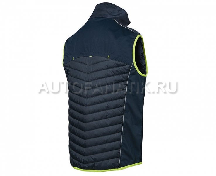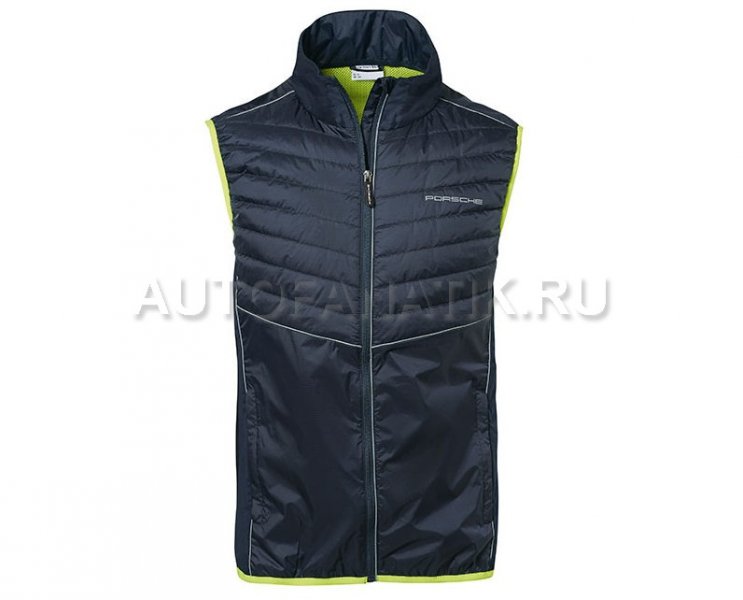 Мужской жилет Porsche, коллекция "Golfsport". Из легкой и прочной ткани. С воротником - стойкой. С мягкими вкладышами и вентиляционными отверстиями для максимального комфорта при занятиях спортом. Ветростойкий и быстросохнущий материал. Жилет легко и компактно складывается в собственнй боковой карман, чтобы сэкономить место. Наружный материал: 65% нейлон, 35% полиэстер. Подкладка: 100% полиэстер. Цвет: темно-синий с яркими акцентами кислотно-зеленого цвета.