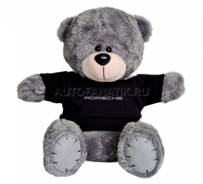 Мягкая игрушка - добрый плюшевый медвежонок. В сером цвете в черной съемной футболке Porsche. Высота 21 см. в сидячем положении.