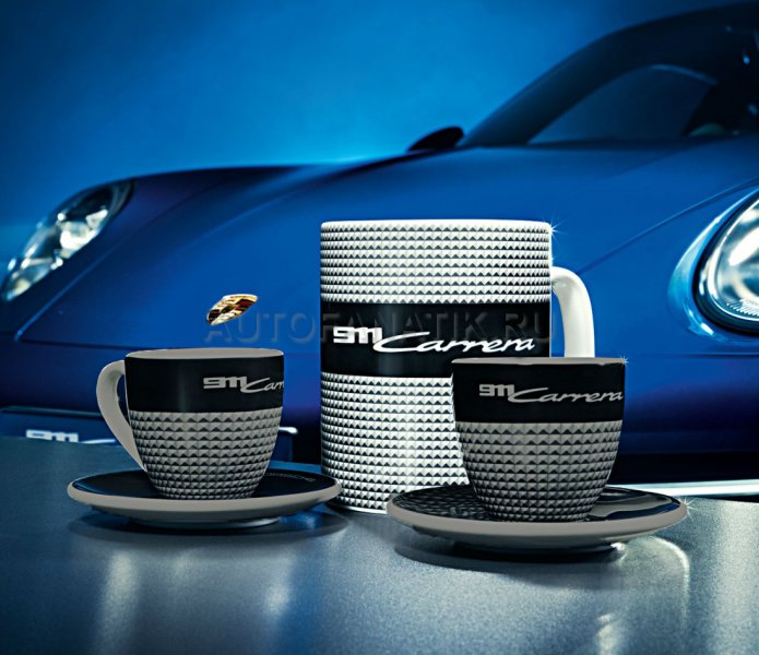 Набор для эспрессо, из 2-х чашек с блюдцами. Цветовое настроение и дизайн в стиле нового 911 в 8-м поколении. На каждом наборе индивидуальный номер из ограниченной серии. Можно мыть в посудомоечной машине. Материал: фарфор. Цветовая комбинация: серый / серебристый / черный. Произведено в Германии.