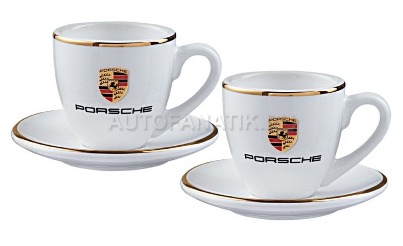 Перерыв. Момент покоя. Чашка горячего эспрессо. Набор из двух фарфоровых чашек с блюдцами в классическом белом цвете и сдержанном дизайне. Герб Porsche, золотистая кайма на чашках и блюдцах. Ваш эспрессо еще никогда не бывал таким вкусным! Можно мыть в посудомоечной машине. Сделано в Германии.