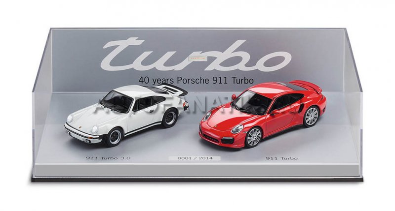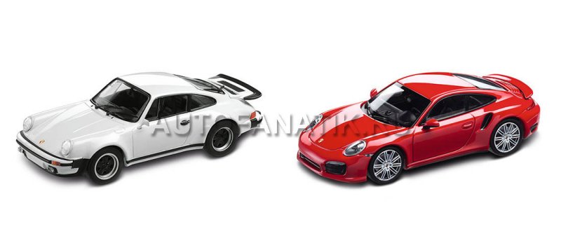 Выпуск ограничен 2014 экземплярами. 911 Turbo: цвет - индийский красный; цвет салона- черный. 911 Turbo (1974): цвет - белый, цвет салона - черный. Из металла. Масштаб 1:43. Артикул: WAP 020 012 0E