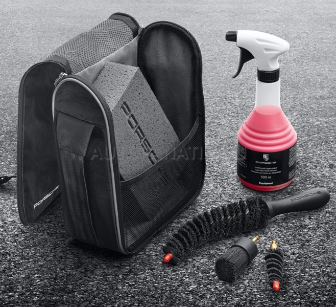 Набор средств по уходу и очистке легкосплавных колесных дисков в практичной сумке. Набор состоит из средства для чистки колесных дисков (бескислотное) в 500 мл. бутылке с пульверизатором, губки, а также комплекта щеток (три штуки) для удаления сильных загрязнений.