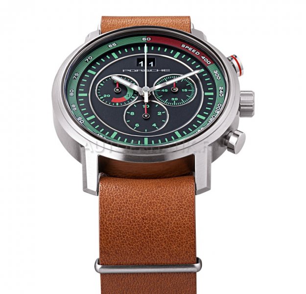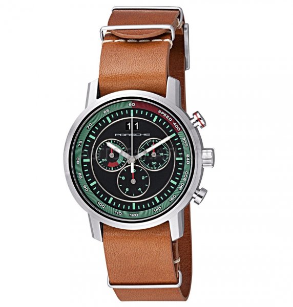 Ограниченная серия - 1356 единиц, каждый хронограф имеет собственный серийный номер. Швейцарский механизм, 13 камней. Тонкий водонепроницаемый корпус: 10 ATM. Металлический циферблат в черно-зеленом цветовом исполнении с историческим логотипом "PORSCHE" в серебристом цвете. Палево-коричневый кожаный ремешок "NATO". Диаметр корпуса: 44 мм. Производство: Швейцария. Артикул: WAP 070 072 0H