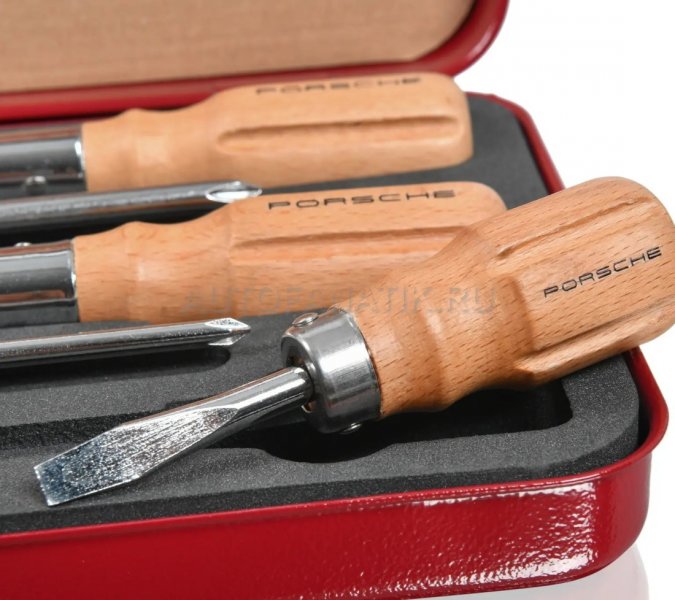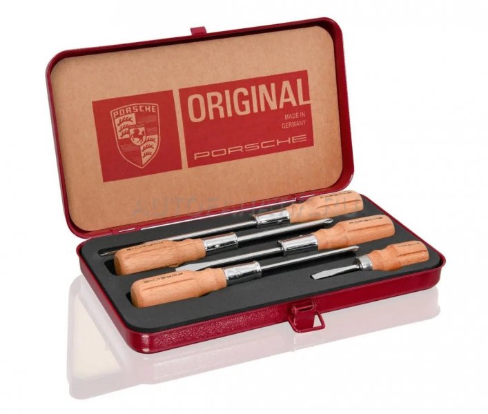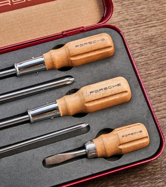 Создан в стиле 1960-х годов: набор отверток с деревянной ручкой и надписью Porsche, состоящий из пяти частей и ящика для инструментов. Содержимое: 1x отвертка с плоской головкой, большая, с приспособлением для крепления ременного шкива (затяжки / замены клинового ремня) Porsche 356 и 912, 1x крестообразная отвертка, большая, 1x крестообразная отвертка, маленькая, 1x отвертка с плоской головкой, маленькая и 1x короткая отвертка с плоской головкой.