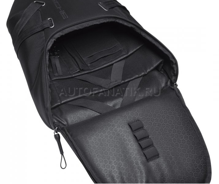 Компактный дизайнерский рюкзак для города. Изготовлен из прочного функционального материала. Логотип «PORSCHE» спереди. Основное отделение с органайзером и карманом для смартфона и прочих небольших предметов и т.д. Мягкий отсек для планшета или ноутбука. С биркой для адреса. Размеры: прибл. 28 х 15 х 43 см. Объем: прибл. 14 литров. Вес: прибл. 0,7 кг. Материал: 100% полиэстер. В черном цвете.