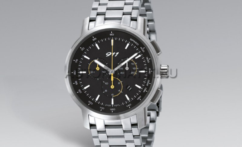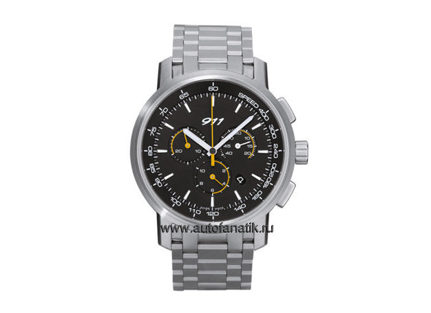 Кварцевый механизм. Измерение промежутков времени и индикация даты. Секундомер до 12 часов и тахиметр. Люминесцентные часовая и минутная стрелки. Массивный корпус из высококачественной стали с антибликовым сапфировым стеклом. Чёрный циферблат с акцентным желтым цветом. Диаметр: 43 мм. Браслет из высококачественной стали или каучука черного цвета. Водонепроницаемый до 100 м. WAP 070 006 0C (Металлический браслет)